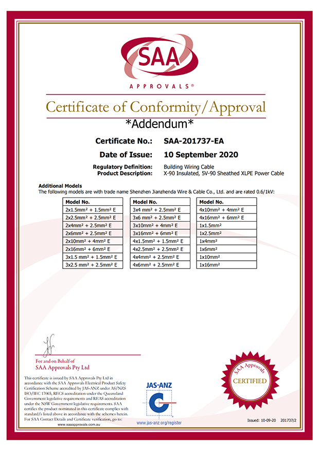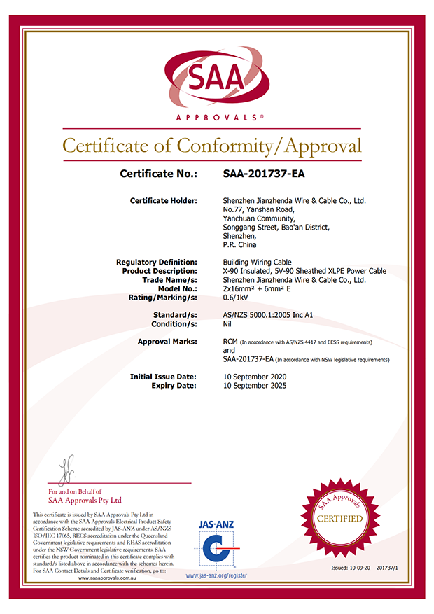 深圳建圳達(dá)電線電纜有限公司,成立于2000年,是一家電線電纜制造商,我們通過了世界各地不同市場的多數(shù)認(rèn)證,如:CCC、RoHS、CB、SAA、TUV、VDE、PSE、BPS、UL、CSA。我們根據(jù)定制產(chǎn)品不斷更新新的認(rèn)證。經(jīng)過數(shù)十年的發(fā)展,我們與來自世界各地的客戶建立了長期的合作關(guān)系。我們曾經(jīng)是菲律賓機(jī)場,,柬埔寨的電力站,美國的醫(yī)院,工廠,埃塞俄比亞的水電站項目。我們是一家值得信賴的電線供應(yīng)商。